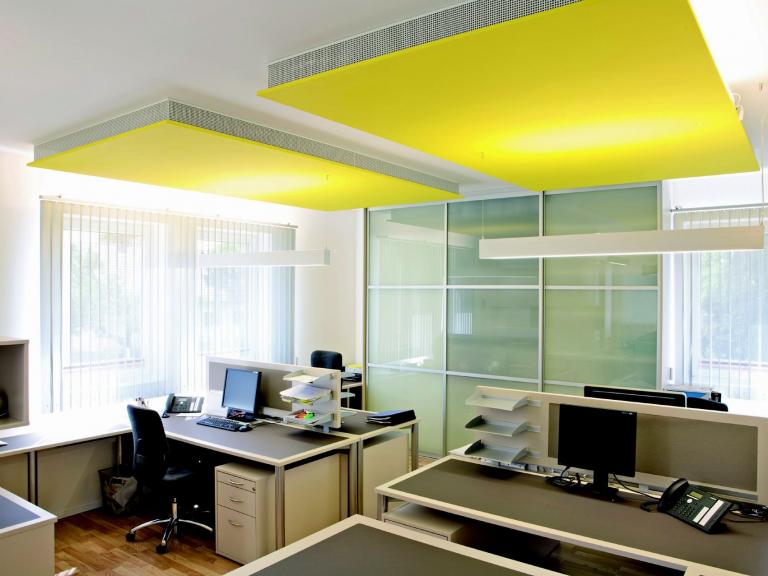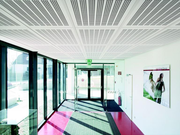 Die Akustikdecke dämpft den Schall und nimmt einen Teil der Geräusche über das Lochmuster und das Akustikvlies in sich auf. Genauer gesagt vermindert sie die Nachhallzeit im Raum: In einem geschlossenen Raum reflektieren die Schallwellen immer wieder vom Boden und von den Wänden, bis sie schwächer werden.